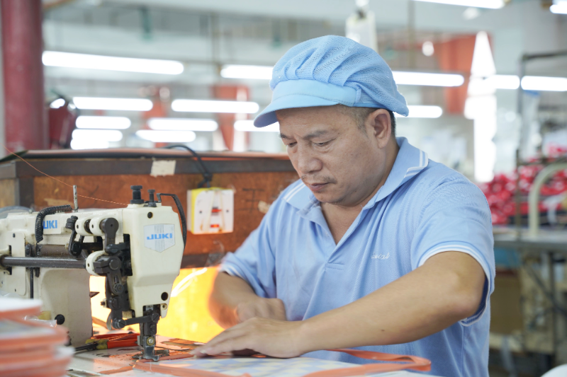 バッグ、ポーチなど縫製品を製造するパートナー工場さまです。社内で生地の印刷から縫製まで一気通貫で作ることができ、品質管理も日本向けに徹底されています。